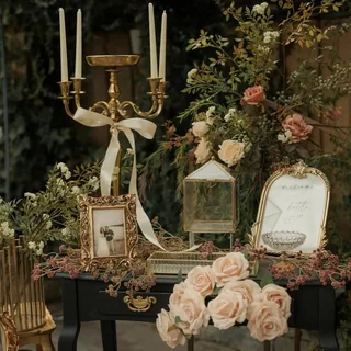 Gold-framed mirrors, vintage candelabras, and lace table decorations are common in this theme. Dark wooden furniture and velvet ribbons add depth and richness to the décor.