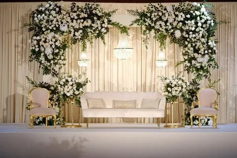 The wedding stage should be the focal point of your decor. Keep it simple yet stylish with soft drapes, subtle lighting, and a well-designed floral backdrop.