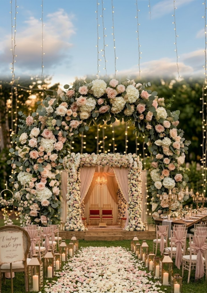 These outdoor wedding decoration ideas create a magical environment for evening celebrations.