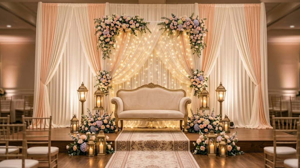 A well-designed stage is often the highlight of many wedding decoration ideas.